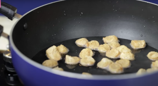 Heat oil in a pan and fry the soya chunks until golden brown and crispy. Remove and set aside.