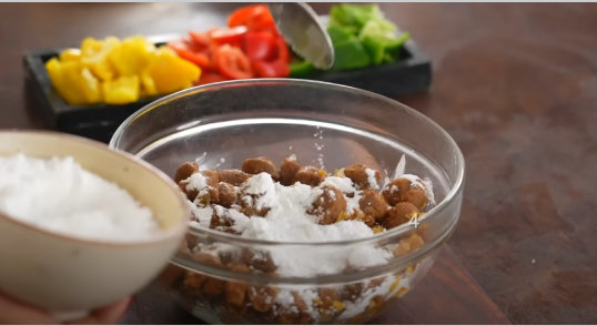 Coat the marinated soya chunks with corn flour and mix well.