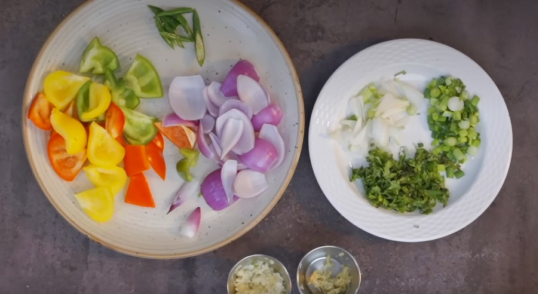 In the same pan, heat 2 tbsp oil. Add ginger garlic paste, green chillies, onions, and capsicum. Sauté for a minute.