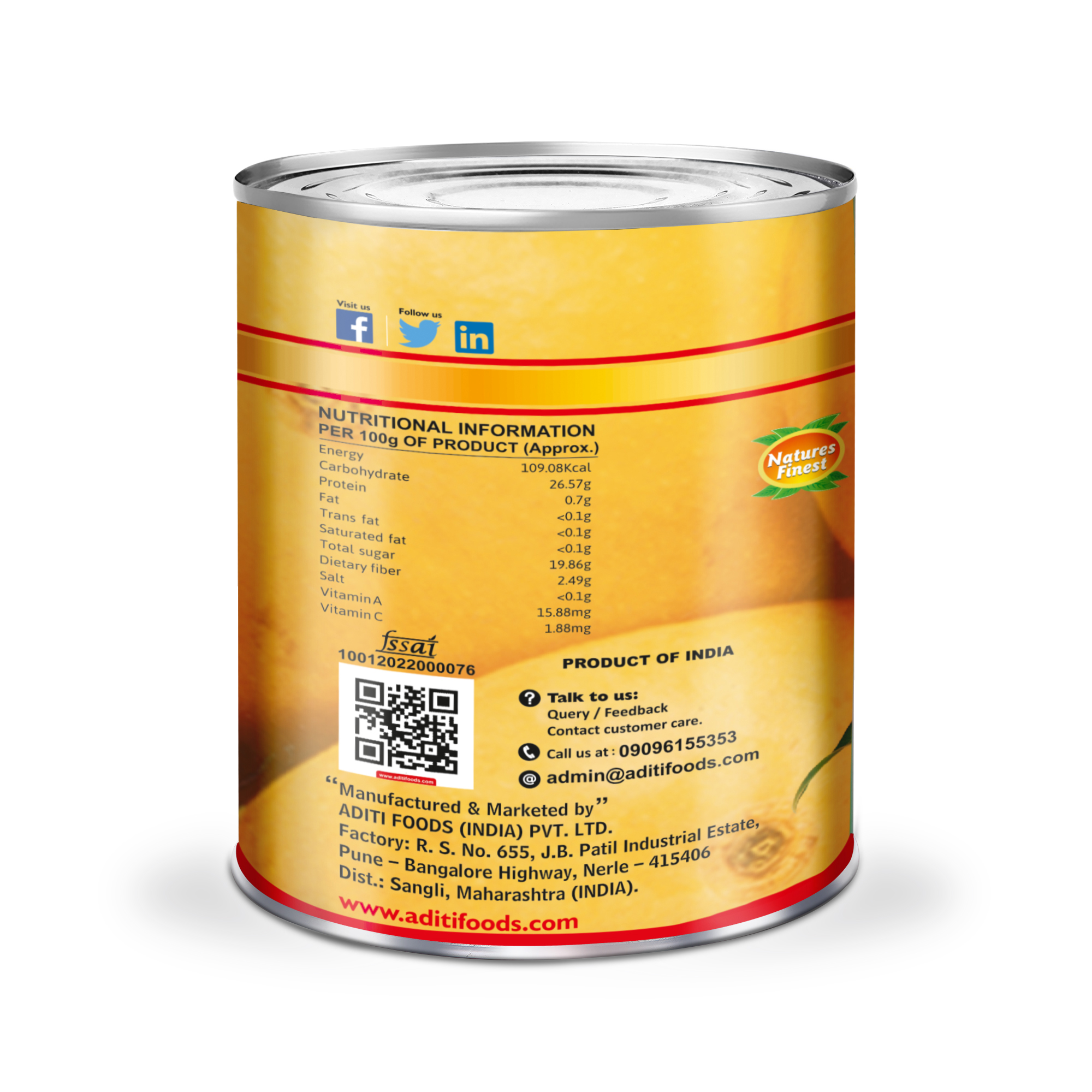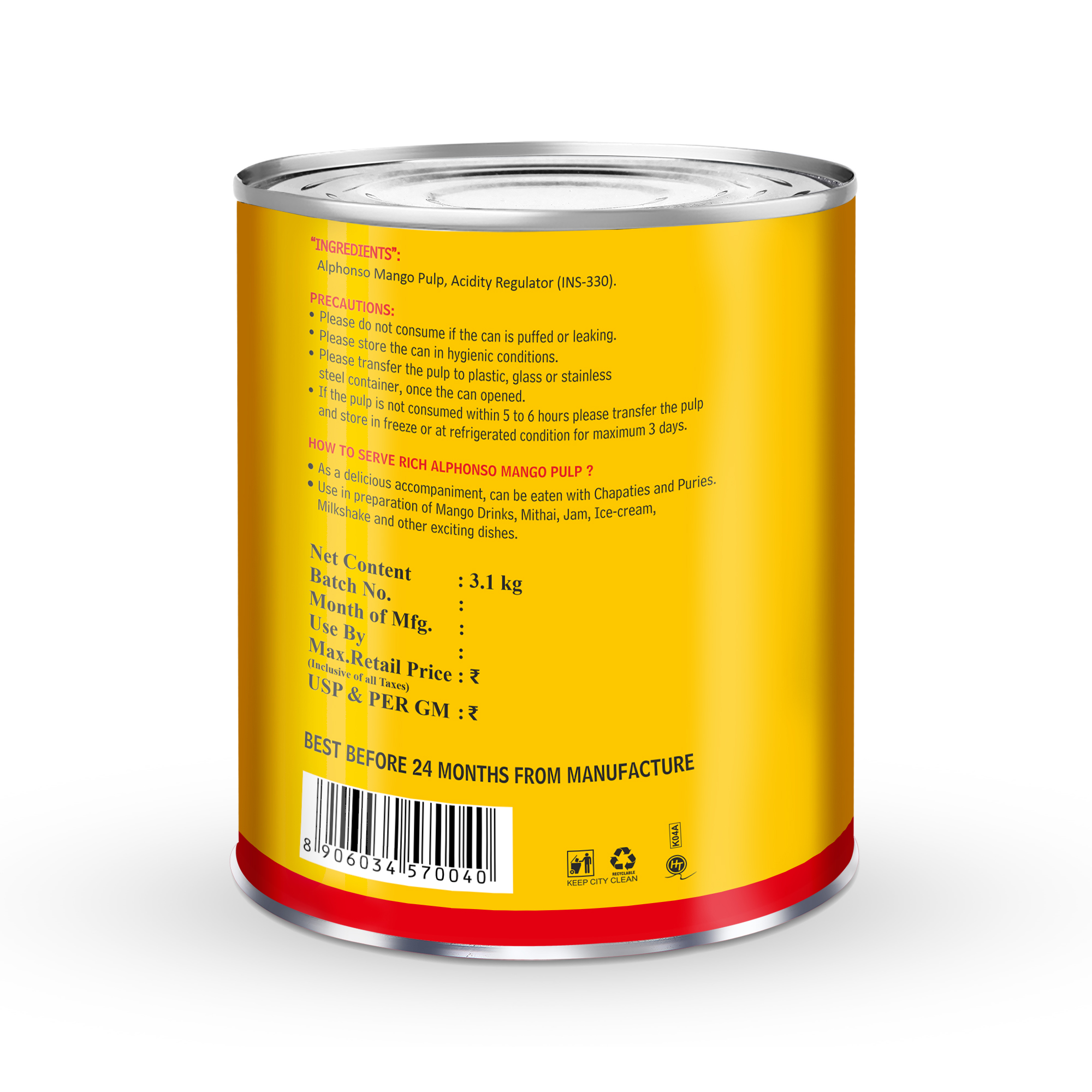 Bring the essence of summer into your kitchen with Aditi Ratnagiri Alphonso Mango Pulp. Crafted from the finest sun-ripened Alphonso mangoes from Ratnagiri, this thick and unsweetened pulp captures the pure, authentic flavor of the fruit in every spoonful. The rich golden color and smooth texture make it perfect for a variety of culinary creations. Whether you’re making refreshing mango smoothies, preparing delectable desserts, or adding a tropical twist to your favorite recipes, this 3.1 kg pack has you covered. Its large size makes it ideal for both everyday use and special occasions. From creating classic aamras to mixing up a quick mango milkshake, the pulp brings the taste of ripe mangoes with no added sugars or preservatives—just the essence of the fruit itself. This Alphonso mango pulp is a convenient way to bring a burst of tropical flavor to your kitchen, no matter the dish. Enjoy the authenticity of Ratnagiri Alphonso mangoes in every can and let your recipes shine with the unforgettable taste of summer.