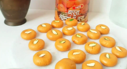 Golden mango peda made with Aditi Hapus Ambyacha Ras, a dash of cardamom, and a hint of saffron, offering a luscious treat that’s perfect for any occasion.